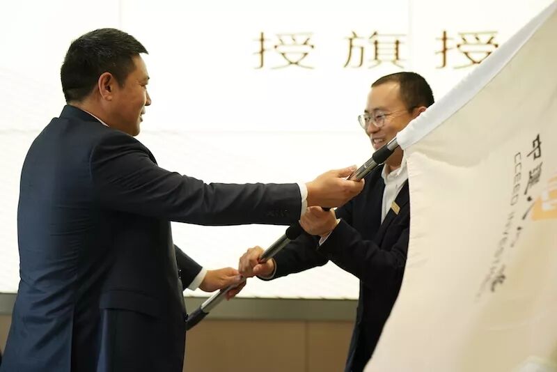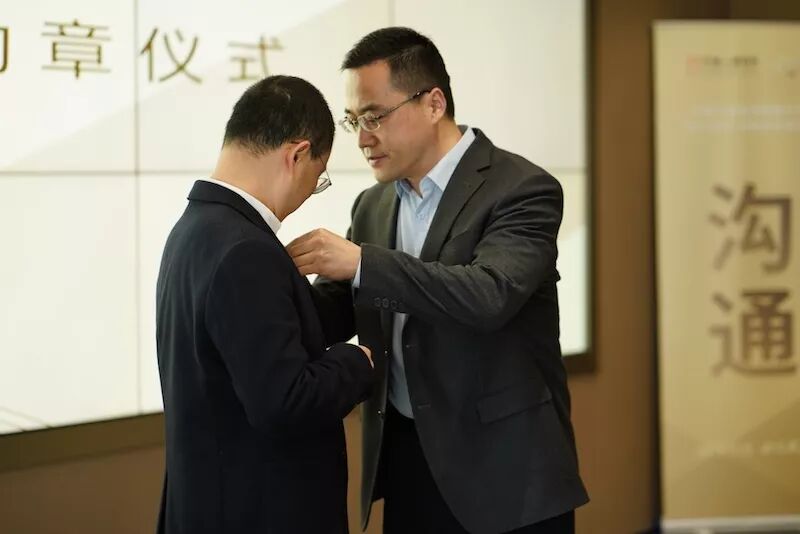 接着正式进入创新营的开营启动环节。首先由党群工作部副经理王淅作为代表,公布了第一批合兴伙伴名单、导师分组及课题情况。由党委书记、董事长朱庆涛为学员代表李纪峰授旗,并由艾肯上海公司总经理王启先生为其佩戴勋章,象征着企业使命的传递和铁军精神的传承。